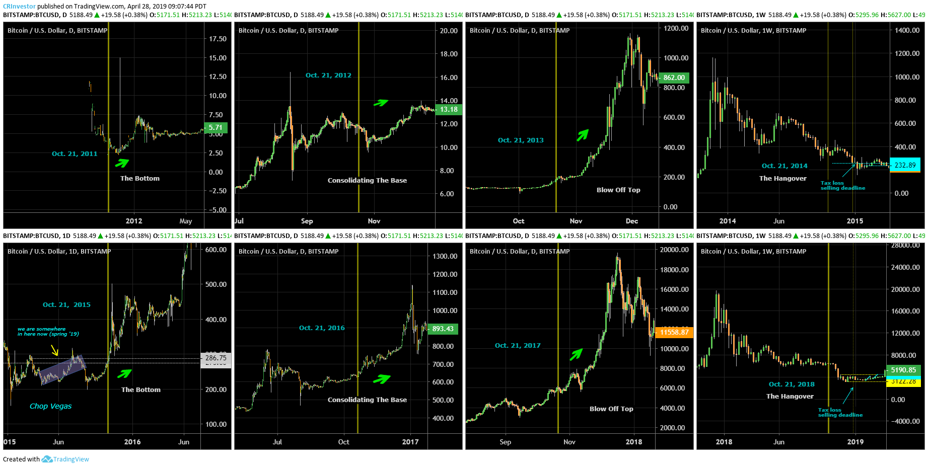 As depicted below (chart courtesy of Beamish), Bitcoin’s price action in 2017 was evidently a “blow off top” and 2018’s was “the hangover,” two macro trends seen in the previous bubble. If Bitcoin continues to follow its trend, 2019 will see BTC rally tremendously, but not without another influx of capitulation first. Beamish suggests that a move to near December 2018’s levels will come in the coming months, potentially as soon as June.