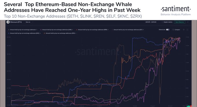 “With most eyes on #Bitcoin’s market price between this $12.7k and $13.3k range, whales of many respective $ETH-based #altcoins have added to their non-exchange bags. $ETH, $LINK, $REN, $ELF, $KNC, & $ZRX are among those recently hitting one-year highs.”